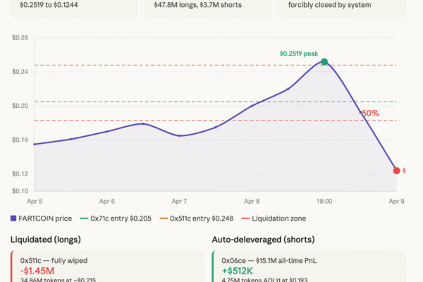 An outsized bet on the meme coin “Fartcoin,” which rocketed it higher, ended in a 50% crash. A group of wallets attempted to push Fartcoin’s price higher by building a $145.24 million token long position on Hyperliquid, the decentralized perpetual futures exchange that has become the venue of choice for leveraged crypto bets during the…