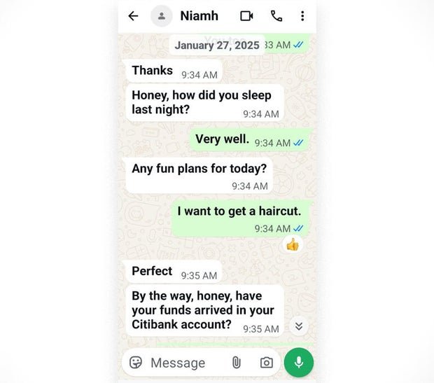 “Honey, how did you sleep last night?” Niamh sent her via WhatsApp early on in the scam. “Any plans for the day?… By the way, honey, have your funds arrived in your Citibank account?”