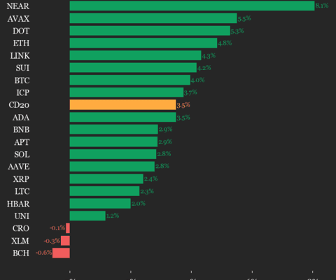 CoinDesk Indices presents its daily market update, highlighting the performance of leaders and laggards in the CoinDesk 20 Index. The CoinDesk 20 is currently trading at 1968.74, up 3.5% (+66.62) since 4 p.m. ET on Friday. Seventeen of 20 assets are trading higher. Leaders: NEAR (+8.1%) and AVAX (+5.5%). Laggards: BCH (-0.6%) and XLM (-0.3%)….