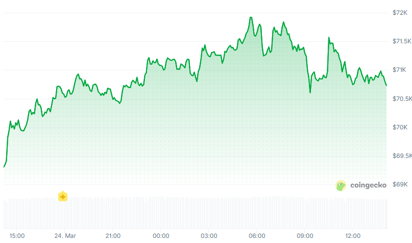 Bitcoin (BTC) is trading at around $71,000, up 2% over the past 24 hours. ETH and SOL gained 3% to $2,175 and $91.5, respectively. Meanwhile, Ripple (XRP) climbed 1.5%.