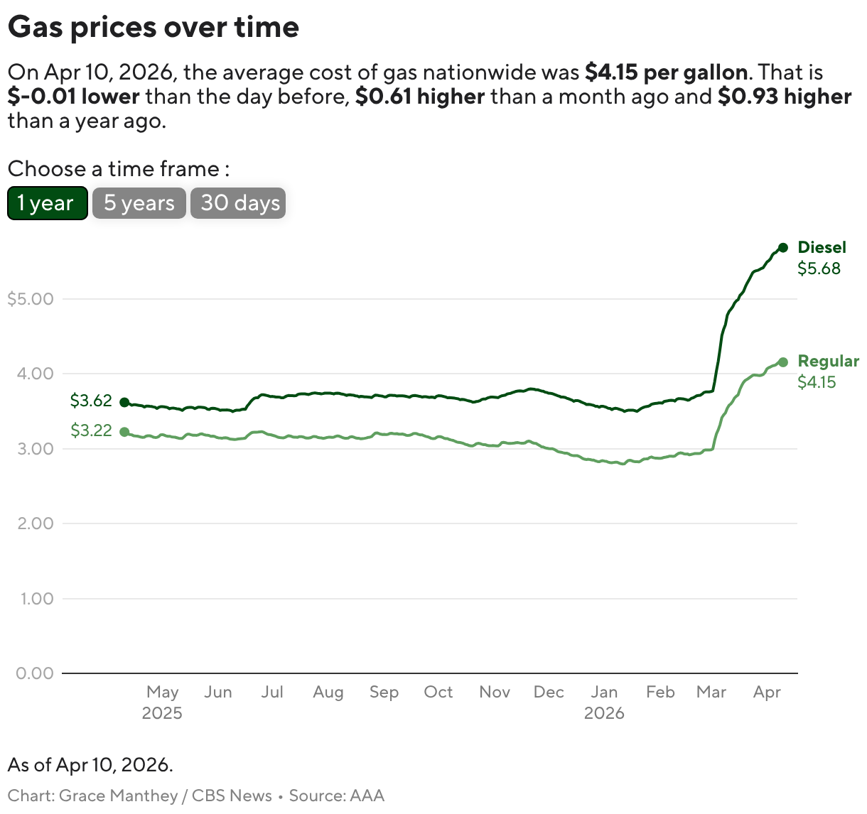 U.S. gasoline prices have soared nearly 40%Â since the conflict erupted, reaching $4.15 a gallon on Friday, according to AAA. The increase represents the biggest one-month jump in gas prices since 1957, according to Pantheon Economics.Â