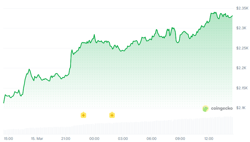 Bitcoin (BTC) is trading at around $74,000, up 3.5% over the past 24 hours. Layer 1 tokens are outperforming, with ETH surging 10% to $2,320, and SOL climbing 8% to $95.
