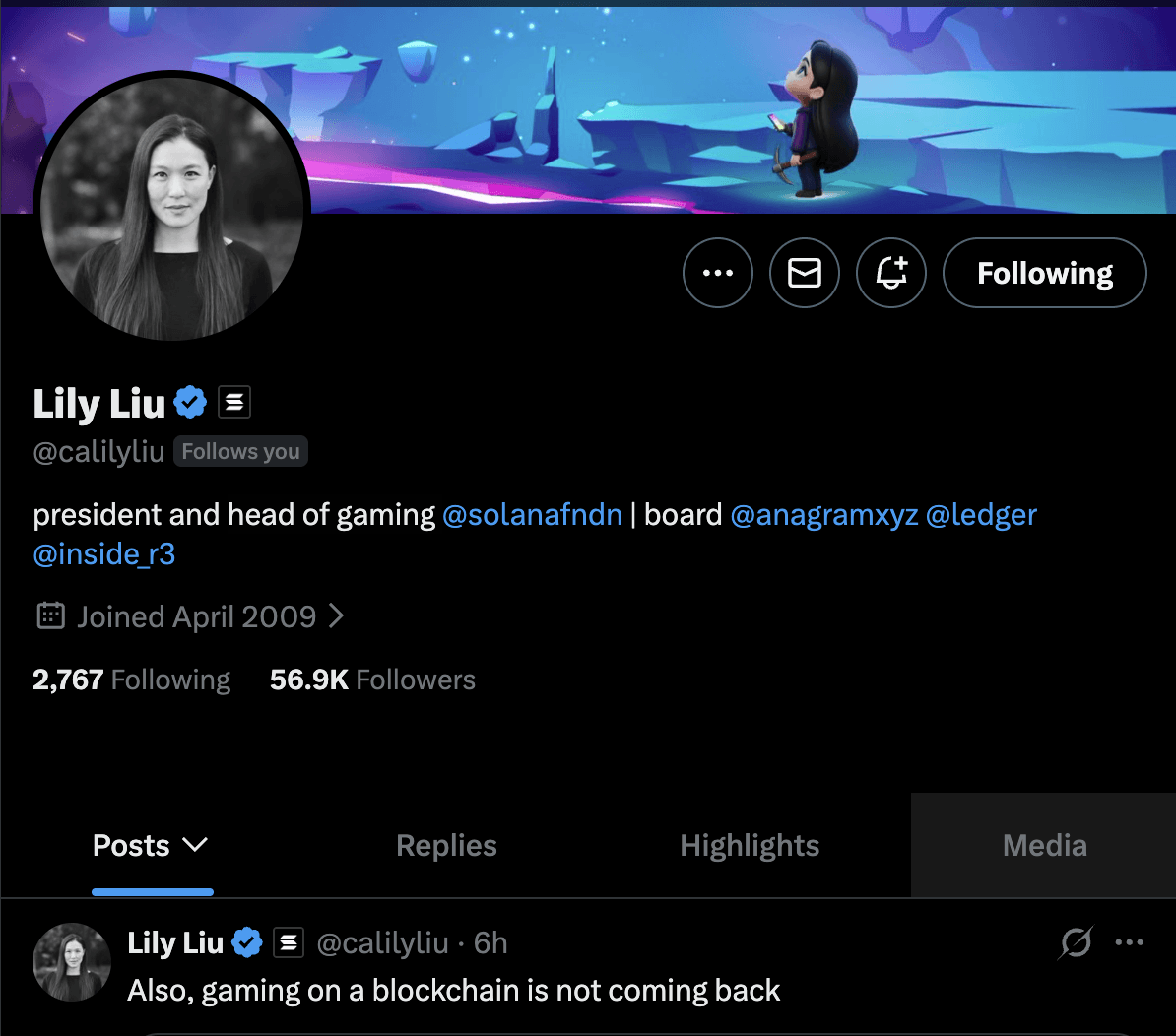Solana Foundation president Lily Liu said blockchain gaming is dead in an X post today, March 20. A later, self-proclaimed “shitpost” from the Foundation’s chief product officer poked fun at Liu’s statement, but the original post had already set off a wave of comments, both criticizing Liu’s take, and defending the future of web3 gaming.